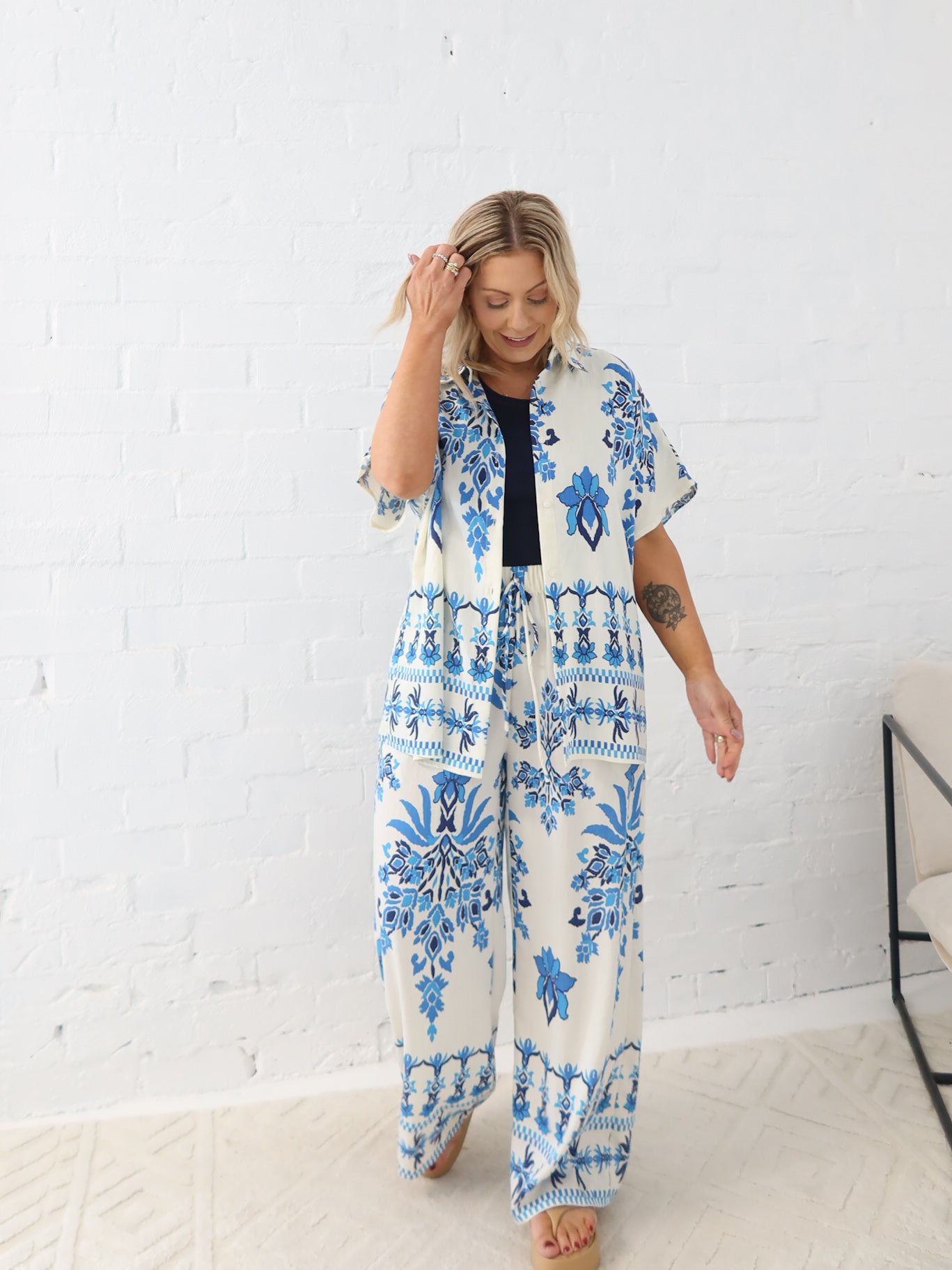 Meet your must have summer pants. The Rosalyn pant has a vanilla base with a bold navy and blue print! Pair them with the matching shirt for a killer co-ord moment or keep it simple with a basic tee.