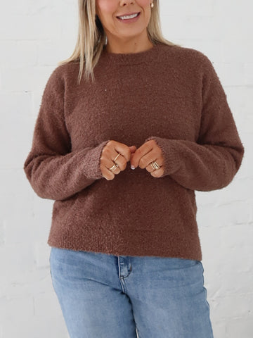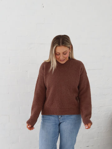 Say hello to Archer! This chocolate-hued knit is super soft and ideal for wearing all year round. 80% Acrylic, 20% Wool Ribbed detailing to the collar, sleeve cuffs and hem....