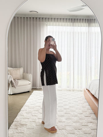 The Celena Top is a modern classic with a chocolate base and white polka dots that keep it playful yet polished. Pairs perfectly with the Celena Pants for a coordinated...
