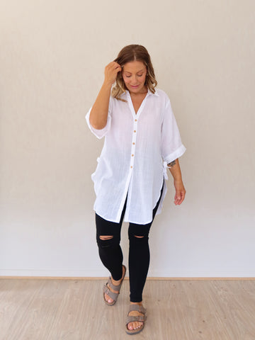 A really versatile style for the warmer days, dress it up with white pants or denim, or wear over bathers on your next getaway.  65% Cotton 35% Polyester  Button down...