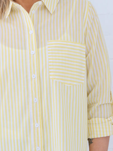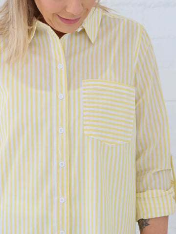 The Emma stripe shirt is absolute perfection.   100% Cotton Button down all the way  Collar  Long sleeve - foldable with tab and buttons  Front breast pocket  High low hemline  Available...