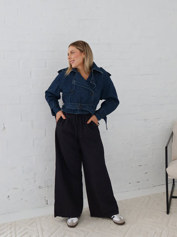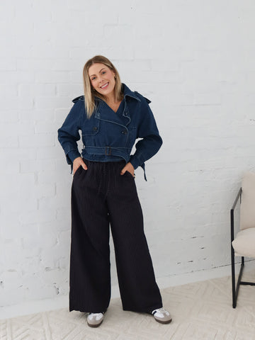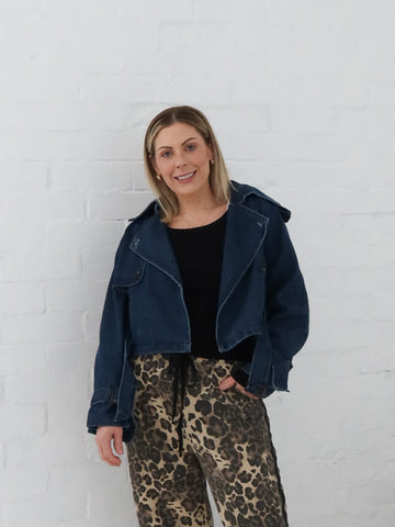 Edgy and stylish, the Hayes jacket is your fresh favorite—think trench coat vibes, but without the extra length. Available in Chocolate and Denim. 100% Cotton Belted  Long sleeve with belted...