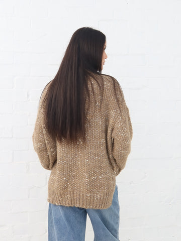 This rustic beauty is so snuggly and warm.  Wool/Polyester  Mocha base with flecks of white Wide round neck  Dropped shoulder  Long sleeve  Loose and oversized  Split hemline  Available in White...