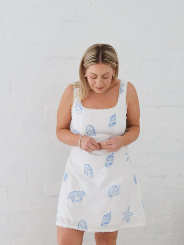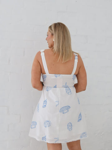 The Marceline Dress! Ocean-inspired in white and blue, and ideal for everything from a picnic in the park to a cheeky arvo sip with the girls. 100% Cotton- Lined Fitted...