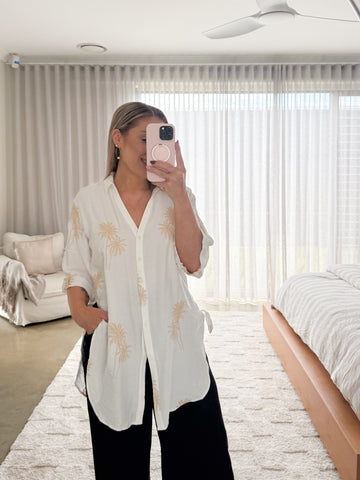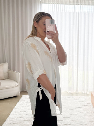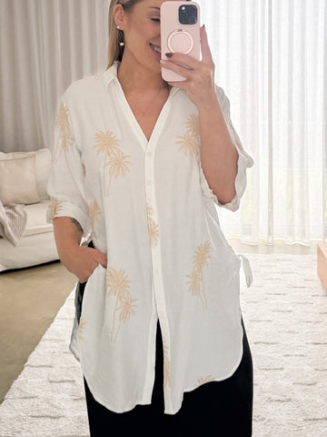 Holiday ready!!  This soft white shirt with palm trees is perfect for sun filled days and beach escapes. Wear it open over your bathers, or pair with denim shorts or...
