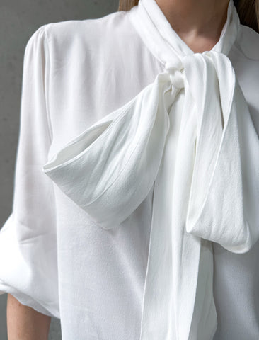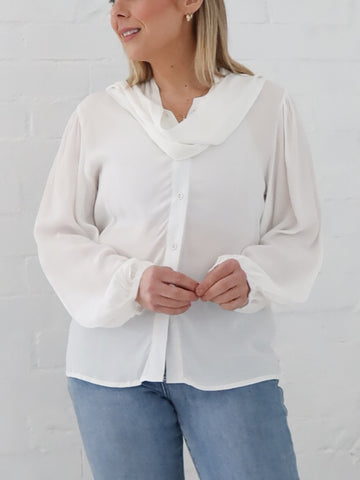 Elevate your wardrobe with this flawless blouse, featuring a distinctive scarf detail that sets it apart and makes every outfit unforgettable. 100% Viscose- no stretch  Featuring neck scarf detail   Elastic...