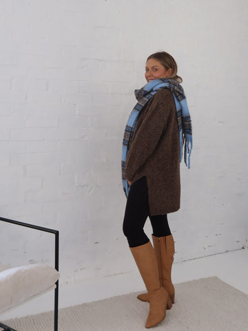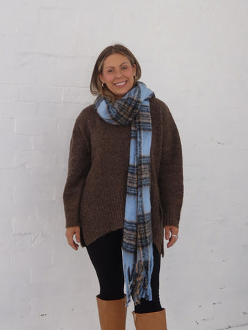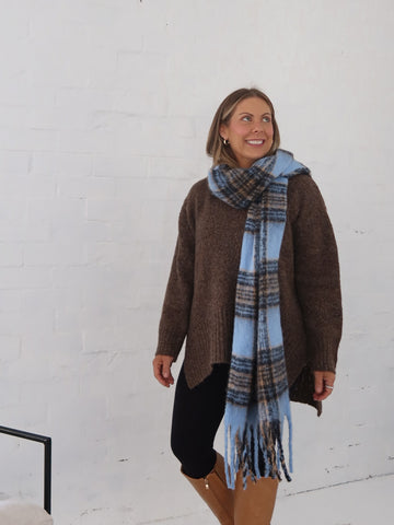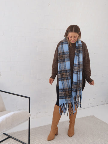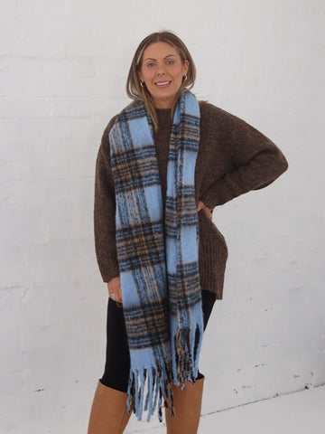 Soft and cozy, Polly scarf is a great winter wardrobe addition!  100% Acrylic Large Blanket Style Scarf  Twisted fringes  Blend of blue, black and tan