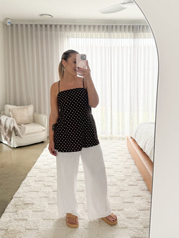 Simple, elegant and understated, the Sawyer Pants are a beautiful addition to your trans-seasonal wardrobe 80% Viscose,20% Linen- Unlined Thin elastic waist  Adjustable Drawstring  Pockets Wide loose leg  Available in...