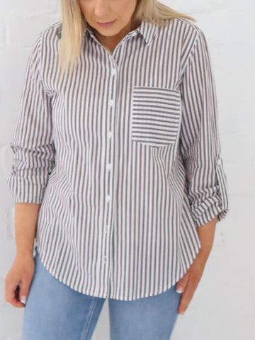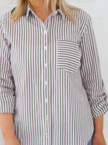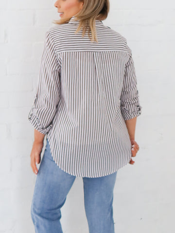 The Emma stripe shirt is absolute perfection.   100% Cotton Button down all the way  Collar  Long sleeve - foldable with tab and buttons  Front breast pocket  High low hemline  Available...