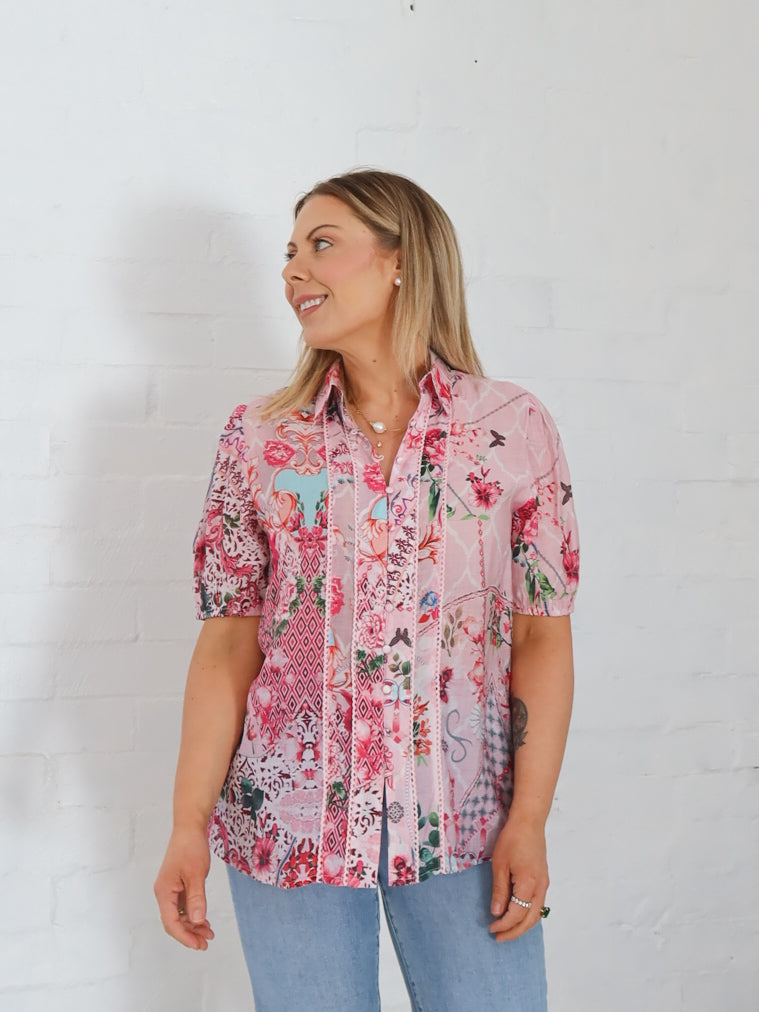 The Stella shirt features delicate lace panel trim! Feminine, fresh, and full of charm.