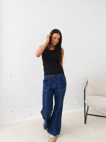 Crazy about wide-leg jeans? Time to grab another pair and keep the fun going! Mid weight stretchy denim - 89% Cotton, 9% Polyester, 2% Elastane Dark Blue denim   High waisted ...
