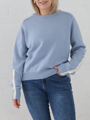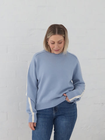Fall head over heels for this cosy and super soft blue and white knit. 50% Viscose 50% Cotton Ribbed detailing to the collar, sleeve cuffs and hem. Wider through the...