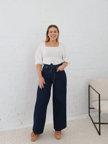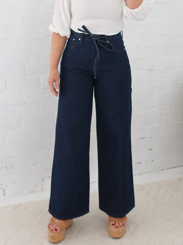 Crazy about wide-leg jeans? Time to grab another pair and keep the fun going! 100% Cotton - Stiff denim  Dark Blue denim   High waisted  Denim tie belt feature Wide leg ...